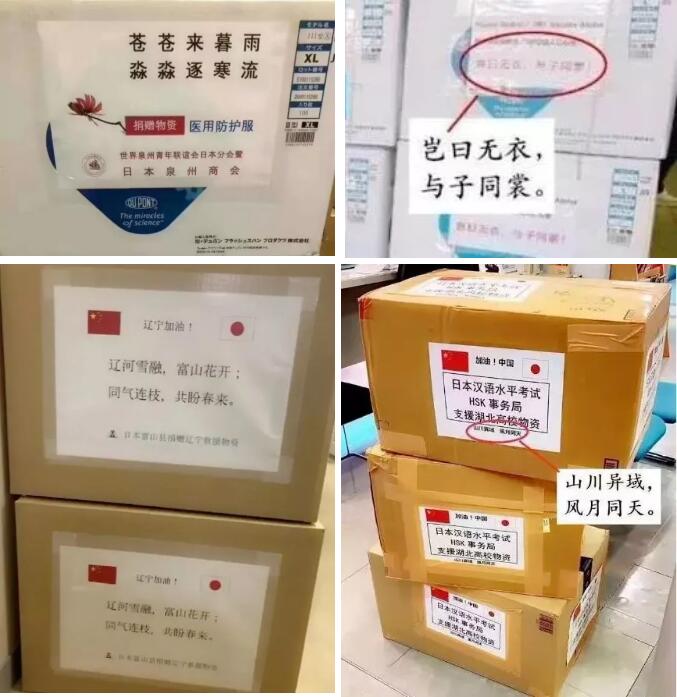 日本政府在疫情開始的第一時刻,就保證會幫助中國渡過難關(guān)。日本株式會社捐贈了3300套防護(hù)服、6000雙鞋套、賦詞豈日無衣,與子同裳。富山縣向友好省縣遼寧省捐贈了一萬枚口罩,上面寫著:遼河雪融,富士花;同氣連枝,共盼春來。HSK事務(wù)所捐贈了兩萬枚口罩,上面寫著:山川異域,風(fēng)月同天。