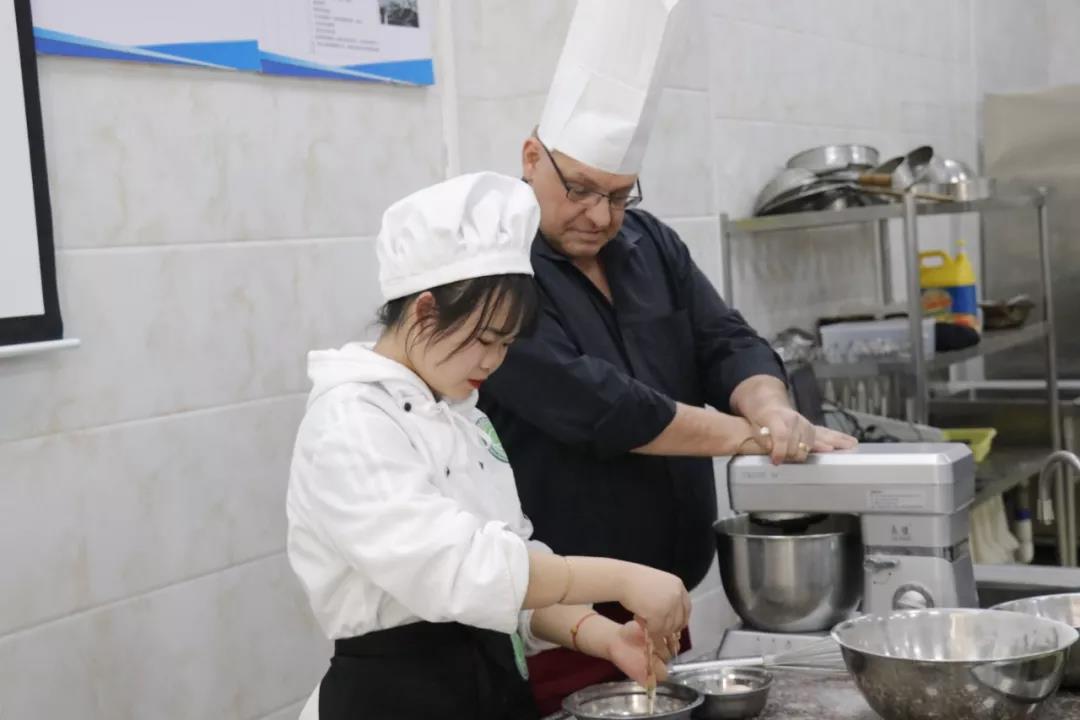 參觀過程中,來賓們對我校中餐烹調(diào)及面點制作課堂表現(xiàn)出強烈的興趣,Mr.Stuart表示,這樣的課堂氛圍非常好,學(xué)生以小組為單位,大家相互協(xié)作,凝結(jié)智慧,制作出的作品都是獨一無二的。